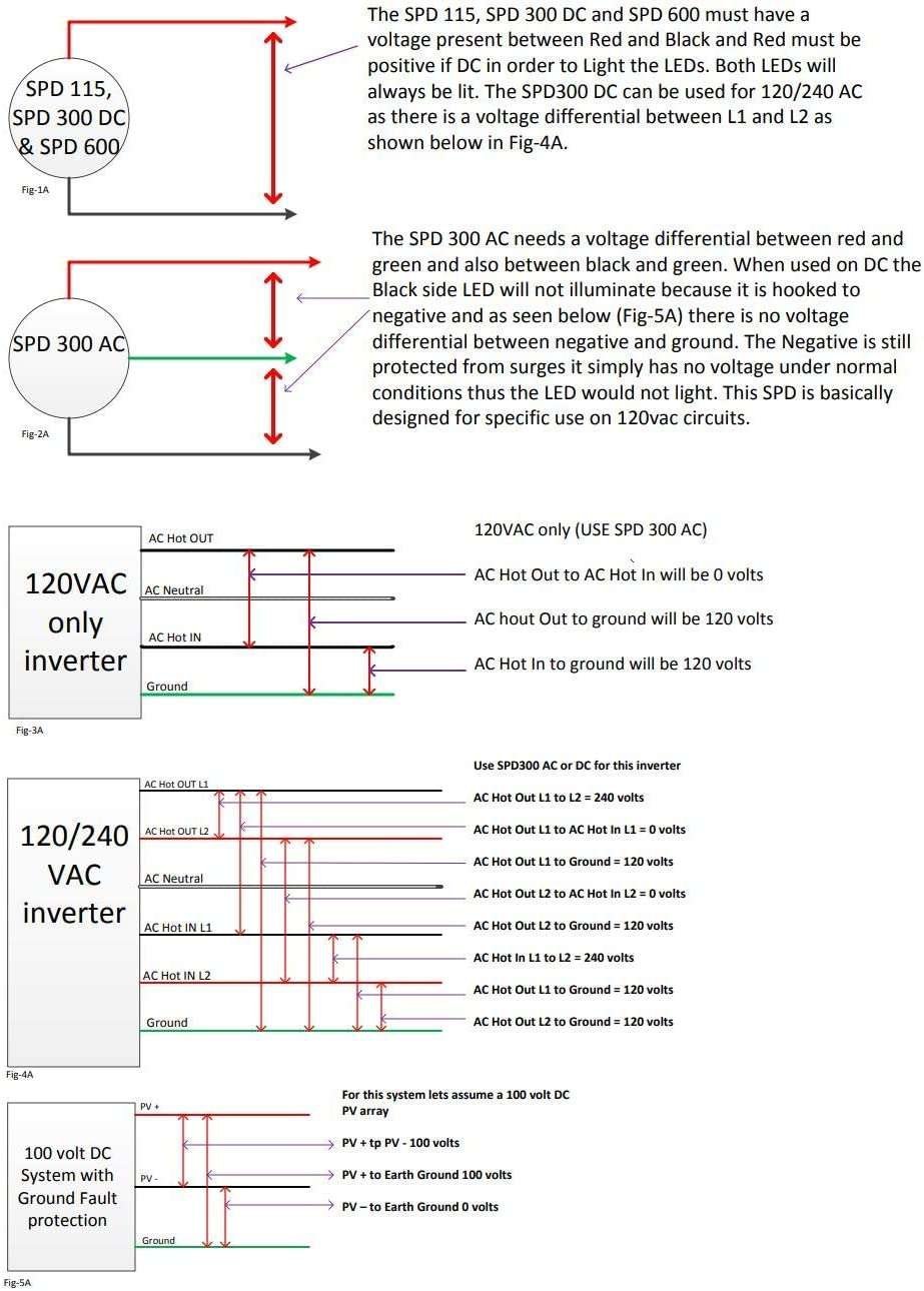 The MidNite Solar Surge Protector Device (MNSPD) is a Type 1 device per UL1449 rev3. It is designed for both AC and DC systems and provides protection to service panels, load centers or where the SPD is directly connected to the electronic device requiring protection. Protection for 120 VAC and 120/240 VAC circuits. Each unit has several lights and a DC unit hooked up to a DC system will power all of the indicator lights and vice versa; an AC unit hooked up to an AC system will power all of the indicator lights. If you hook a DC unit to an AC system, however, only 1 of the indicator lights will work and vice versa, but the unit will still be safe and function properly.