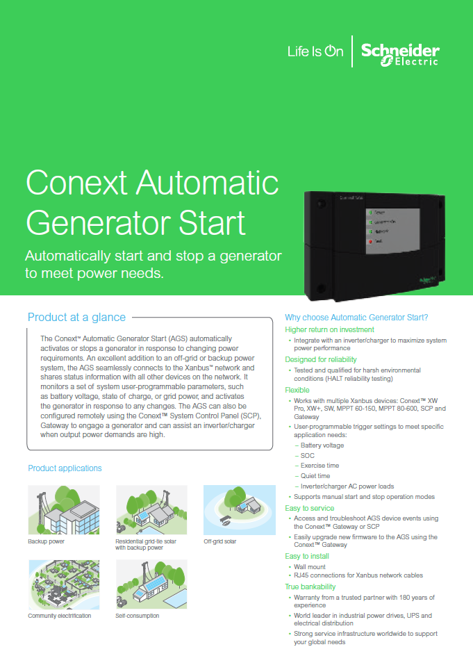 The Conext Automatic Generator Start (AGS) can automatically activate or stop a generator in response to changing power requirements. Excellent addition to an off-grid or backup power system, the AGS seamlessly connects to the Xanbus network and shares status information with all other devices on the network. It can monitor a set of system user-programmable parameters such as battery voltage, state of charge, or grid power and can activate the generator in response to any changes. The Conext AGS can also be configured remotely using the Insight energy management system to engage a generator and can assist an inverter/charger when output power demands are high.