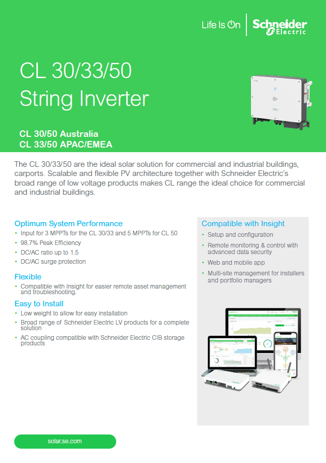 The CL 30/33/50 are the ideal solar solution for commercial and industrial buildings, carports. Scalable and flexible PV architecture together with Schneider Electric’s broad range of low voltage products makes CL range the ideal choice for commercial and industrial buildings.