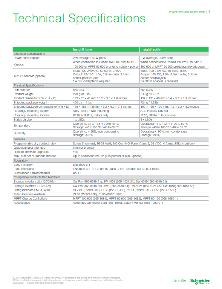 InsightHome is perfect for smaller residential systems. InsightFacility supports larger residential and small commercial applications. Both InsightHome and InsightFacility are compatible with Schneider Electric’s solar & storage offerings, including the XW and SW lines of storage inverters, the MPPT solar charge controllers, and the accessories.