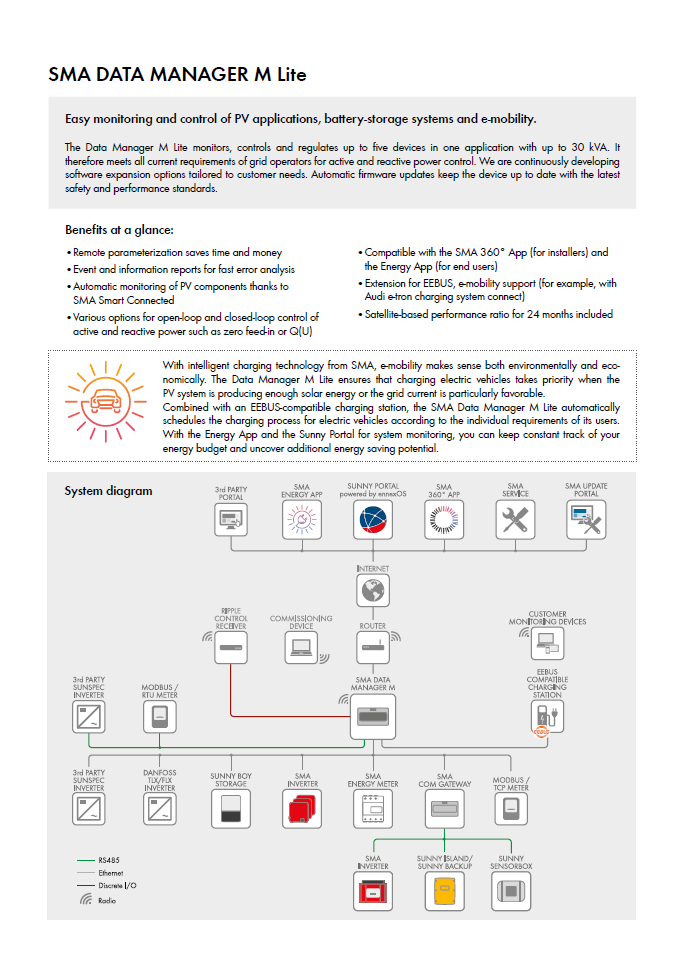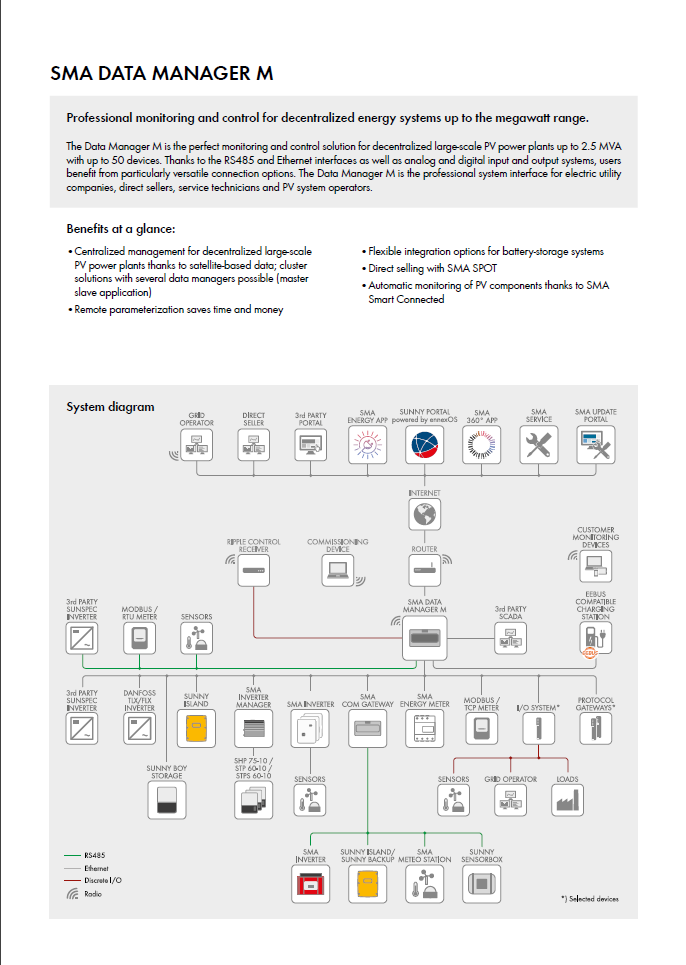 In combination with the Sunny Portal powered by ennexOS, the Data Manager M enables monitoring, management, and grid-compliant power control in decentralized PV systems. Thanks to flexible expansion options, the Data Manager M is already well-equipped for business models in the energy market of the future. The Data Manager M is the ideal professional system interface for electric utility companies, direct sellers, service technicians, and PV system operators.